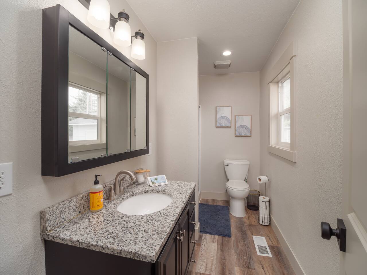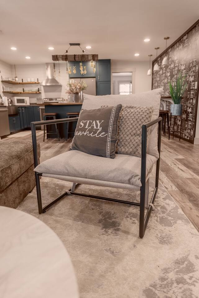 Step into an open-concept living space where bold Spacious and Stylish Living Area Step into an open-concept living space where bold design meets modern comfort. Thoughtfully created to blend serene elements with industrial accents, this space is both welcoming and chic. • Cozy and stylish atmosphere with soft neutral tones and pops of indigo blue. • Industrial light fixtures and designer wall textures set the tone for a unique, modern retreat. • High-end LoveSac sectional sofa, known for its luxury and comfort, perfect for sinking in after a day of exploring. • Large smart TV for streaming your favorite shows or movies. • Ample natural light pours in from large windows, creating a refreshing ambiance. • Board games and puzzles available for cozy nights in. Fully Stocked Kitchen & Dining Designed for those who love to cook and gather, this kitchen offers everything you need for a complete dining experience. • Stainless steel appliances: full-size refrigerator, stove, oven, microwave, and dishwasher. • Coffee station with coffee maker, tea kettle, and a selection of coffee and teas. • Complete set of cookware, utensils, and bakeware for all your culinary needs. • Open shelving and live edge wood countertops provide both functionality and style. • Granite countertops add a sleek touch to the space. • Easy access to the outdoor dining area for meals under the stars. Serene and Luxurious Bedrooms Each bedroom is designed with comfort in mind, offering high-quality beds and ultra-soft linens for restful sleep. Every room includes extra pillows for added comfort. • Primary Bedroom (King): A tranquil retreat featuring a king-size bed with hotel-quality bedding, designed for a luxurious night’s sleep. Blackout curtains ensure a peaceful, uninterrupted night’s rest. USB charging ports for bedside lamps. • First Queen Bedroom: Stylish and comfortable with a queen-size bed, high-quality pillows, USB charging ports and blackout curtains for a restful night. Thoughtfully designed with handpicked decor and soft lighting, ideal for families, couples, or remote workers. • Second Queen Bedroom: Featuring two queen beds, this spacious room offers high-quality bedding, extra pillows, USB charging ports, designed with a cozy, modern aesthetic. Perfect for guests who prefer more sleeping space or families traveling together. Bathrooms Designed for Relaxation Immaculately appointed bathrooms designed for both function and relaxation. • En Suite Bathroom (Primary Bedroom): Full bathroom with modern tile, walk-in shower, towels, hand towels, washcloths, and premium bath essentials (shampoo, conditioner, body wash, and Mrs. Meyer’s hand soap). • Shared Bathroom: A well-appointed space with a tub-shower combo, stocked with towels, hand towels, washcloths, and premium bath essentials to keep you feeling refreshed throughout your stay. Outdoor Oasis The perfect place to relax and unwind, the private backyard retreat features everything you need for outdoor enjoyment. • Cozy seating area for lounging and relaxing. • Gas fire pit for cool evenings under the stars. • BBQ grill for outdoor cooking (guest is responsible for filling the propane). • Lawn games to enjoy with family and friends. • Ambient lighting adds a touch of warmth and comfort. Other Home Features • Complementary Q-Tips, cotton pads, and make up wipes for your convenience. • Washer, dryer, and laundry/dish soap provided. • Ample parking space available for your vehicles. • Board games, puzzles, and other entertainment for cozy nights in. Professionally Managed & Spotlessly Clean Indigo Collective is professionally managed to ensure a seamless experience for all guests. The home is kept spotless, and we pride ourselves on providing the highest level of cleanliness and comfort. Our local host is available 24/7 for anything you need before, during, or after your stay.